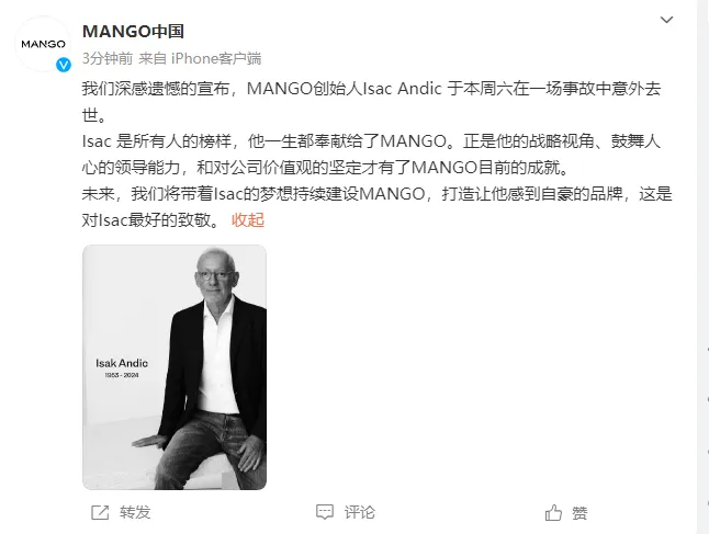 今天下午,时尚品牌@MANGO中国 官博发文表示,MANGO创始人Isac Andic于本周六在一场事故中意外去世。