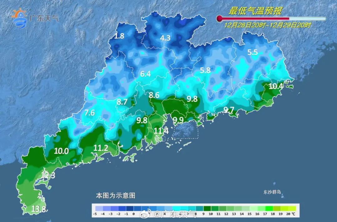 29日,广东全省晴天。最低气温:粤北、珠江三角洲北部市县1℃~6℃,高海拔山区零下3℃~1℃,局部有霜(冰)冻,雷州半岛市县12℃~14℃,南部沿海市县9℃~12℃,其余市县6℃~9℃。
